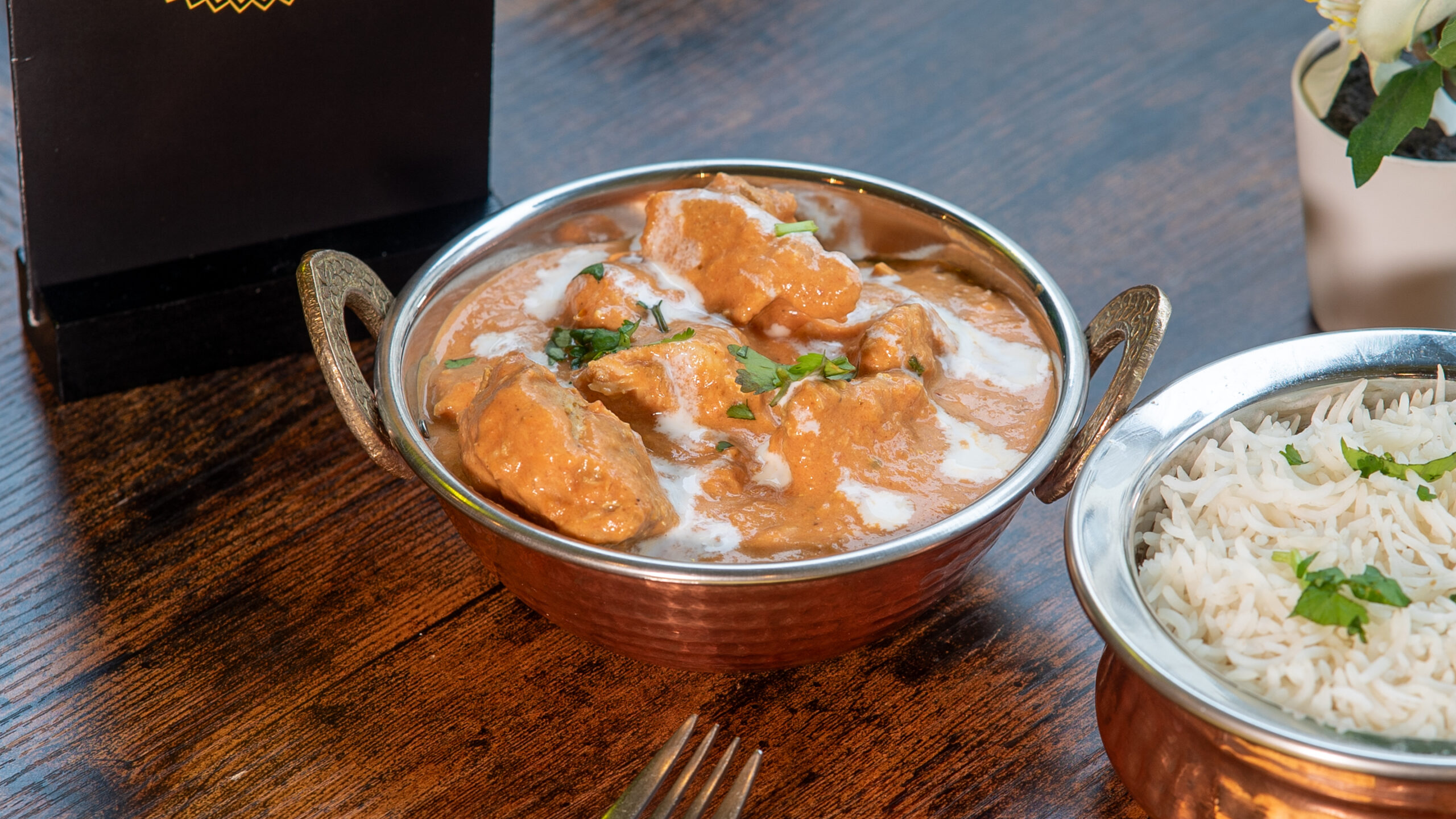 Poulet crémeux au beurre et sauce tomate parfumée aux épices du Kerala, servi avec du riz.